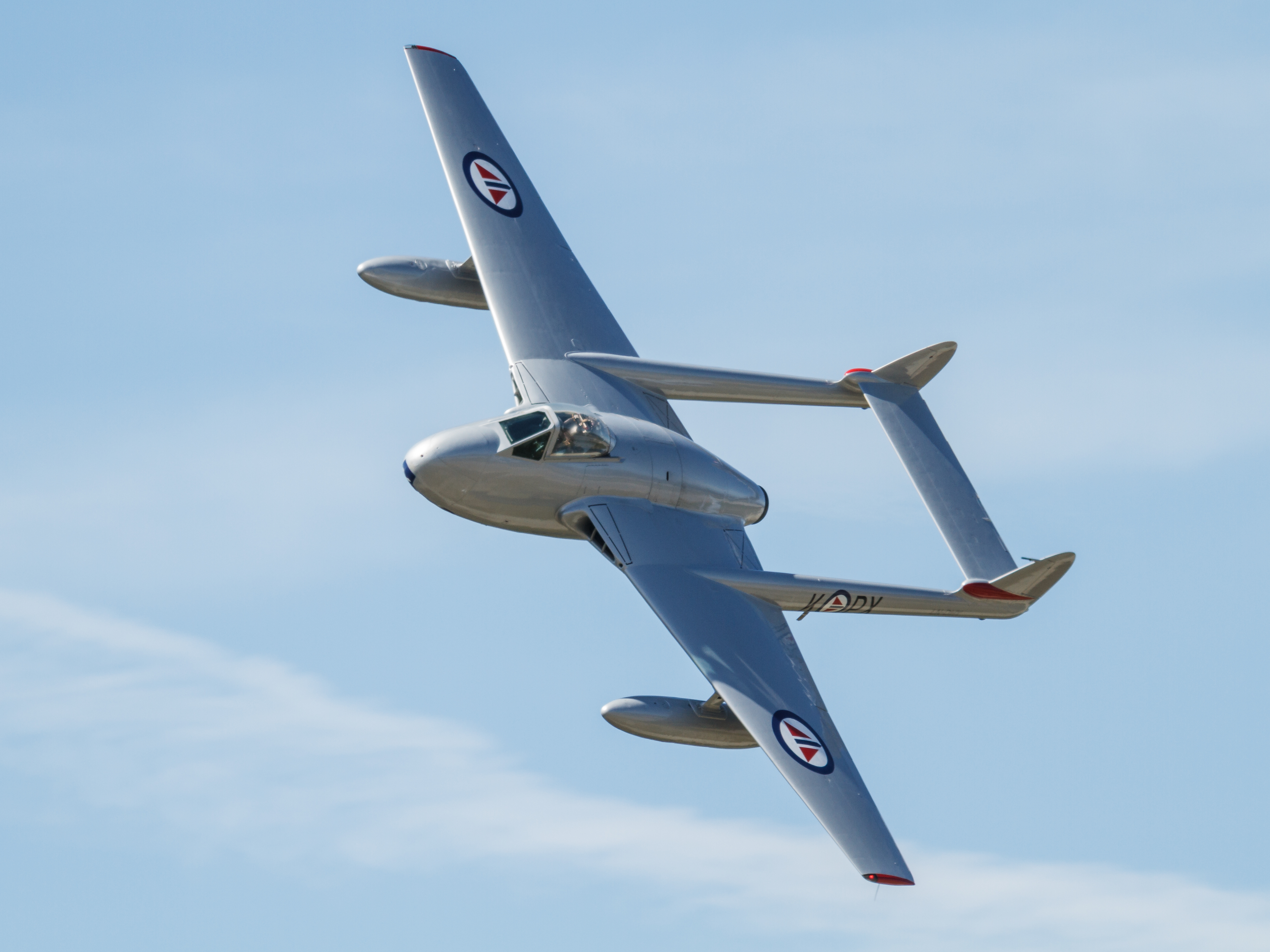 Flydagen Sola får besøk av de Havilland Vampire FB.52 PX-K. Flyet opereres av Flyvåpnets Historiske Skvadron som med sine fire historiske jetfly, som i tillegg til Vampire innkluderer en T-33 og en Mig-15, er svært aktive på europeiske flystevner. Vampire flyr et fantastisk flott display og lyden fra Goblinmotoren er som søt musikk. Deltakelsen av Vampire er mulig blant annet på grunn av økonomisk bidrag fra BlueWay Offshore Norge AS og K. Lund Offshore. Foto Eirik Østensjø.