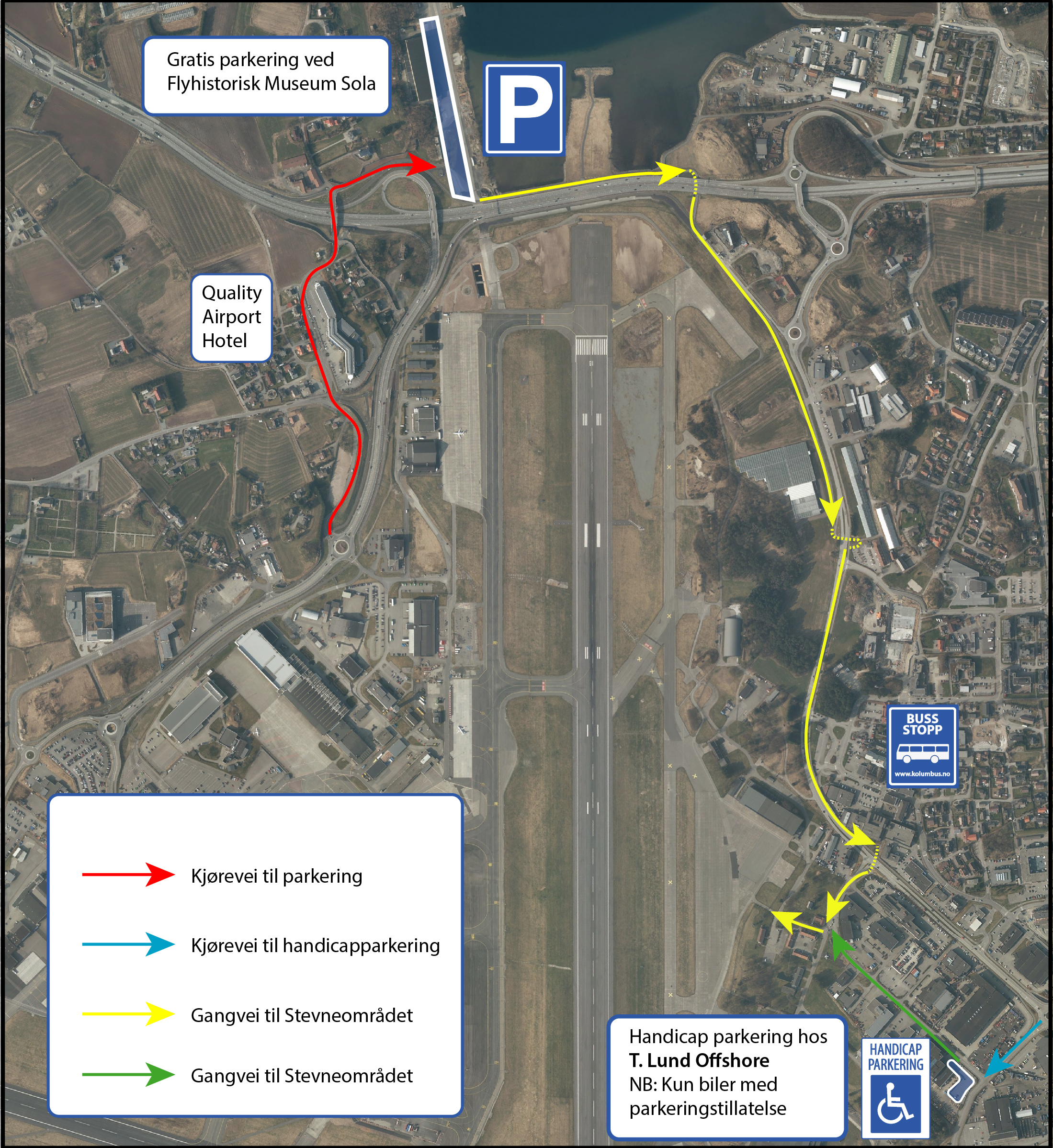 Gå deretter til stevneområdet gjennom porten til Sola Flystasjon (gul pil på kartet). Derfra følges skilting til publikumområdet og billettsalg.