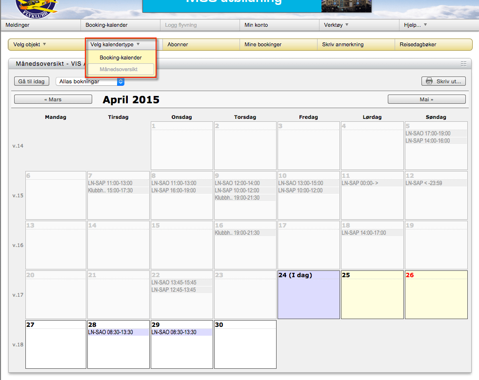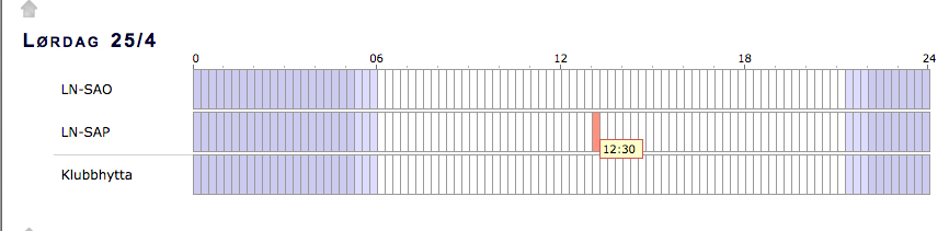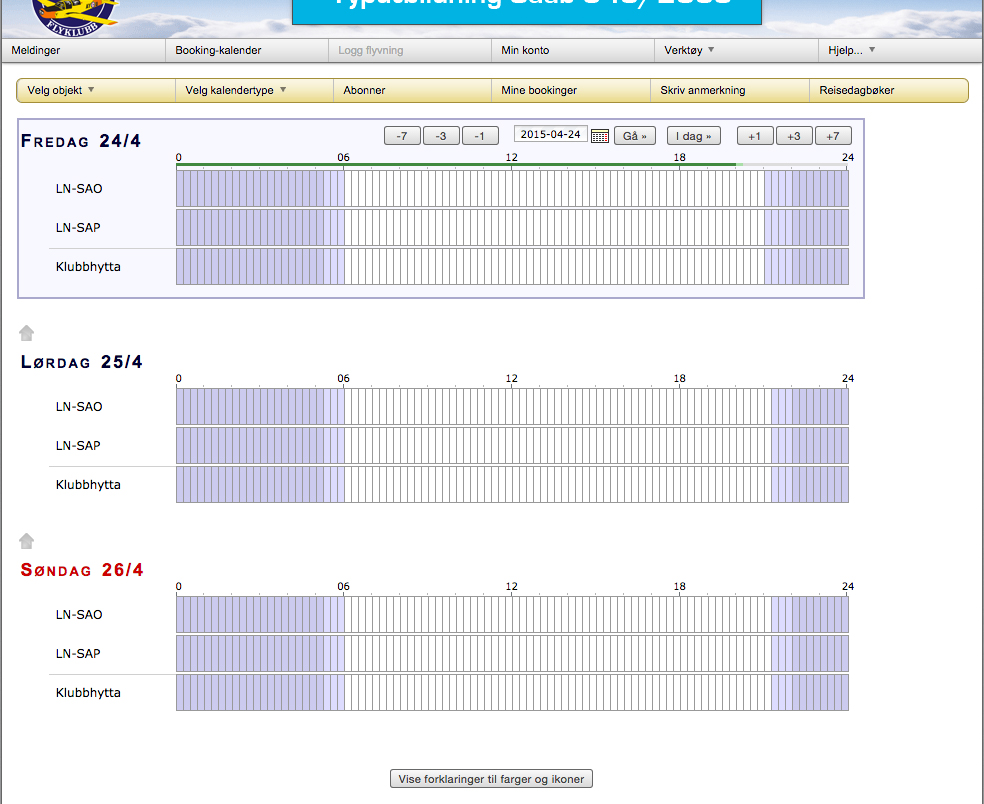 Når du kommer inn i myWebLog møter du bookingkalenderen. Standardoppsettet viser dagens dato pluss de to kommende dagene i 15-minutters blokker for hvert fly.