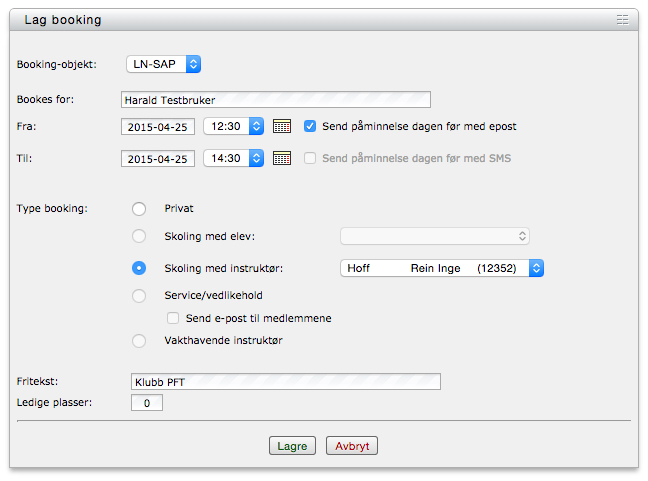 og fyller inn nødvendig informasjon som flyindivid, klokkeslett, om du skal ut med instruktør, etc.
