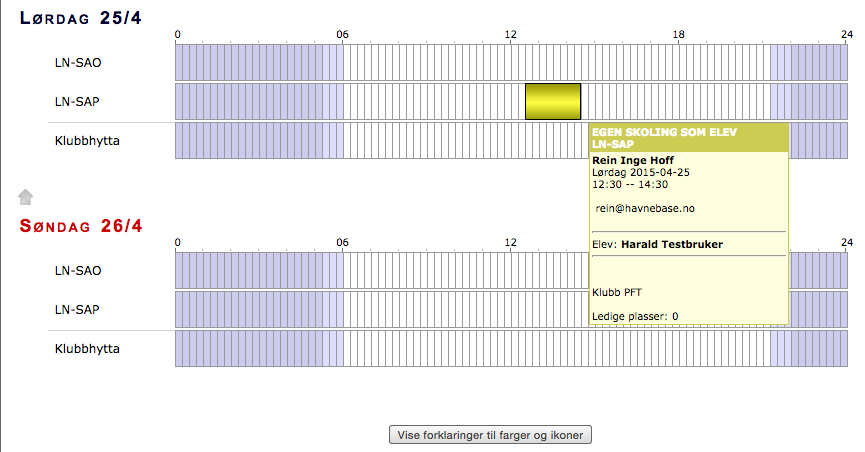 Når du er ferdig og trykker “Lagre” kommer du tilbake til bookingkalenderen og kan se bestillingen din. Hvis du holder markøren over en booking får du se detaljer om denne bookingen.